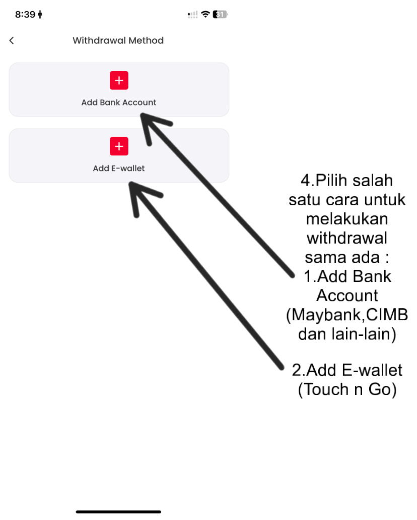 Berikut adalah cara membuat withdrawal masuk ke akaun bank atau e-wallet:
